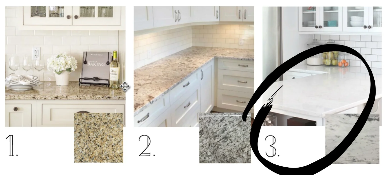 Here are three options I have pulled together to get a feel in direction for selecting countertops. Option 1 & 2 are granite and option 3 is quartz. Options 1 & 2 are similar in material and markings but different in color. Option 3 is quarts and a completely different overall appearance than option 1 & 2.